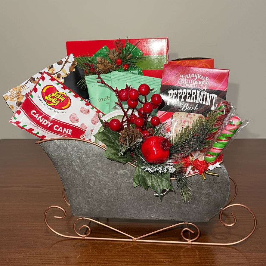 Celebrate the magic of the season with Dashing Through the Snow, a festive gift sleigh filled with cozy comforts and sweet holiday treats. Thoughtfully arranged in a charming sleigh container, this gift delivers the perfect blend of indulgent sweets and savory favorites—ideal for clients, colleagues, friends, or family.