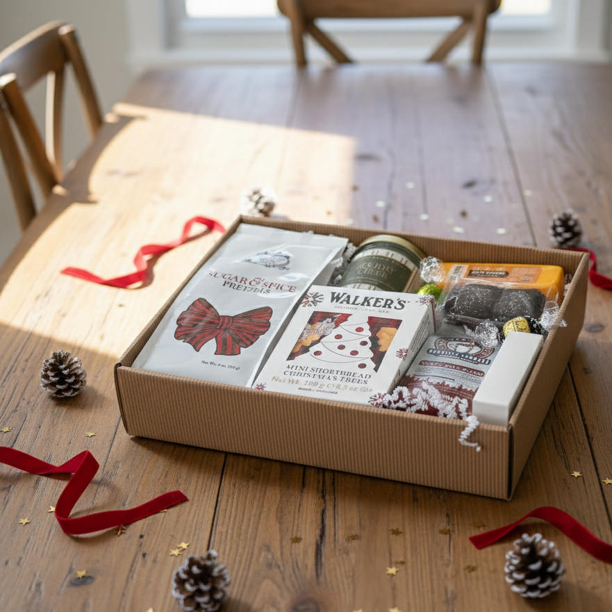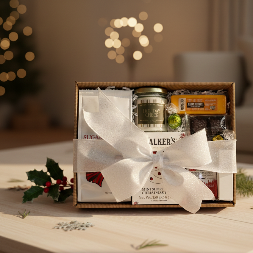Inside, you’ll find crunchy pretzels and crackers paired with rich cheese, buttery shortbread cookies, and an assortment of chocolates, including smooth Lindor truffles. A comforting cup of coffee and a beautifully scented candle of your choice complete this inviting holiday experience—ideal for sharing or savoring solo.