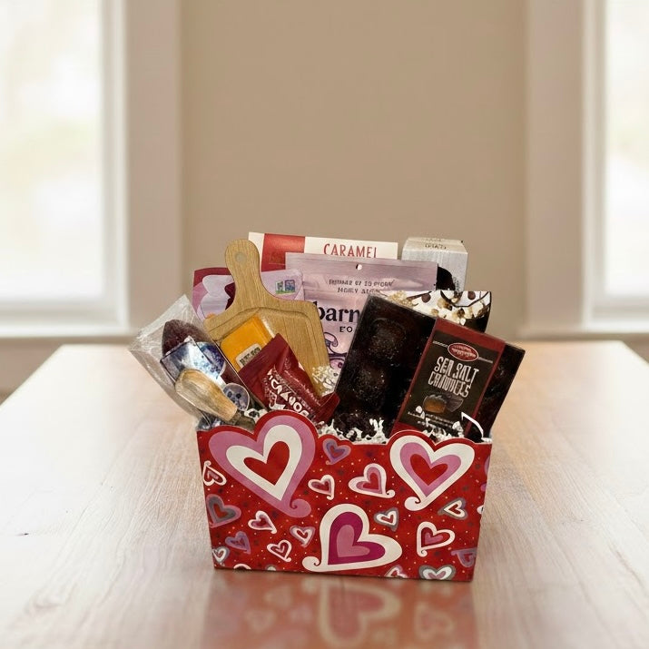 From rich artisan snacks to chocolatey treats meant to be savored, each item invites sharing—or quiet moments enjoyed together. Finished with a charming cutting board for effortless entertaining, this basket delivers romance in every detail.