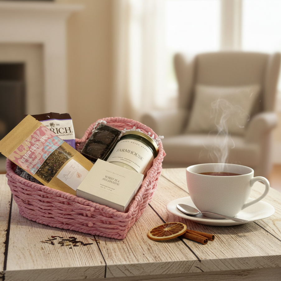 Send a heartfelt moment of calm and indulgence with our With Love Gift Basket, beautifully arranged in a charming pink heart-shaped basket. Designed for cozy evenings and meaningful gestures, this thoughtful gift blends soothing self-care with sweet treats to delight the senses. A jasmine & white tea scented bath bomb invites relaxation, while a candle of your choice sets the mood for unwinding. Paired with comforting tea, decadent chocolates, and chocolate-covered blueberries, this basket is perfect for Valentine’s Day, anniversaries, thank-yous, or simply reminding someone they are loved. Elegant, comforting, and full of warmth, it’s a gift that speaks straight from the heart.